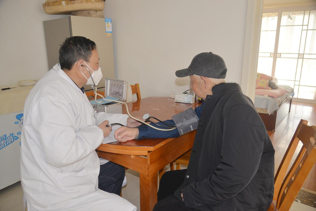 近日,灌東鹽場黨群工作部工作人員和家庭保健醫(yī)生來到行動不便的離休干部家中,進(jìn)行上門健康體檢。 -